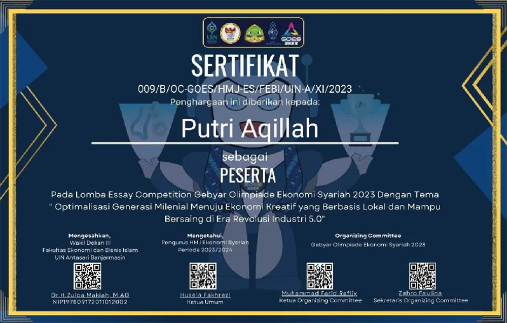 Lomba Debat Gebyar Ekonomi Syariah 2023 merupakan ajang kompetisi tingkat nasional yang diselenggarakan oleh Universitas Islam Negeri (UIN) Antasari Banjarmasin sebagai bagian dari rangkaian kegiatan Gebyar Ekonomi Syariah. Kompetisi ini mengusung tema “Optimalisasi Generasi Milenial Menuju Ekonomi Kreatif yang Berbasis Lokal dan Mampu Bersaing di Era Revolusi Industri 5.0.” Tema tersebut menekankan pentingnya peran generasi muda dalam mengembangkan potensi ekonomi kreatif lokal melalui prinsip-prinsip syariah yang berkeadilan dan berkelanjutan. Sebagai semifinalis, saya berkesempatan beradu argumen dengan peserta dari berbagai perguruan tinggi di Indonesia dalam membahas isu-isu strategis terkait ekonomi syariah dan inovasi kreatif di era digital. Proses debat yang kompetitif melatih saya untuk berpikir kritis, menyusun argumen logis berbasis data, serta mempertahankan pendapat dengan komunikasi yang efektif. Selain memperluas wawasan tentang ekonomi Islam dan ekonomi kreatif, pengalaman ini juga meningkatkan kemampuan analisis, kolaborasi tim, dan kepercayaan diri dalam berbicara di depan publik. Lomba ini menjadi momentum berharga dalam membentuk generasi muda yang berintegritas, inovatif, dan siap menghadapi tantangan ekonomi global berbasis nilai-nilai Islam.